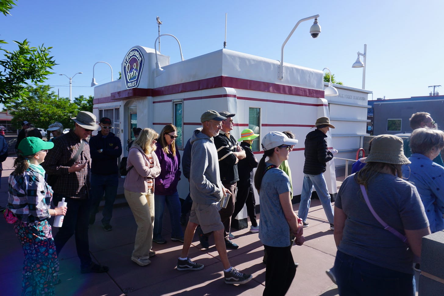 A group of about 25 people gathered at Nob Hill’s Triangle Park police substation May 3 for a 90-minute, 2.5-mile walk featuring the unique homes, buildings and history that make the area an Albuquerque attraction.