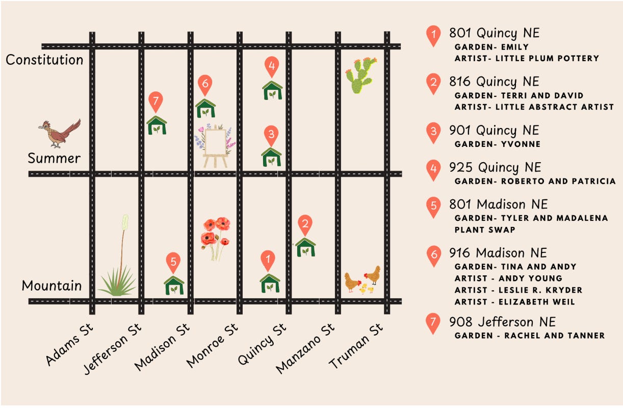 The Pueblo Alto Neighborhood Association is hosting a tour which includes seven gardens and five artists May 17 from 9:00 a.m. to 12:00 p.m. Each stop will be marked with a bee flag.