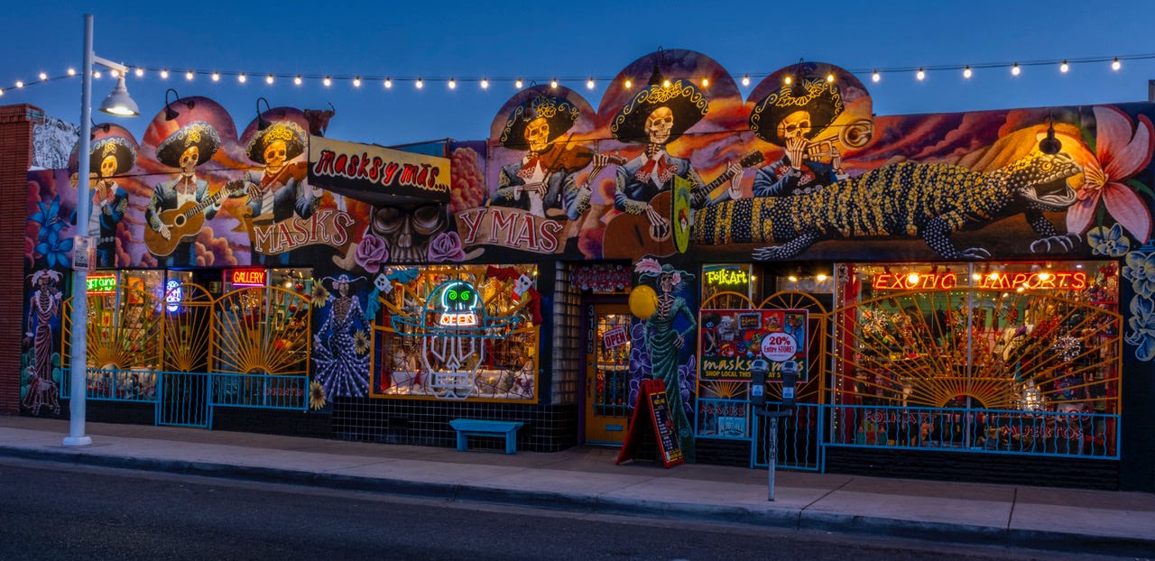 The 1939-built Jones Motor Co. building at Central Avenue and Wellesley Drive is a Route 66-era landmark. It was once a Ford Motor Co. car dealership with curved garage bays, a central tower, and white coloration typical of the Streamline Moderne style. It is currently a M'tucci's Italian restaurant.