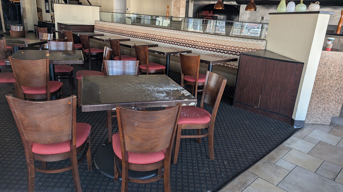 A visit to the site Jan. 20 showed a big crack on a large exterior window and a patio area still scattered with tables and chairs that have been exposed to the elements and copious amounts of pigeon poop. A peek through the front door revealed a dining room frozen in time, but also one with ceiling pieces that have fallen on a table from some sort of deterioration from above.